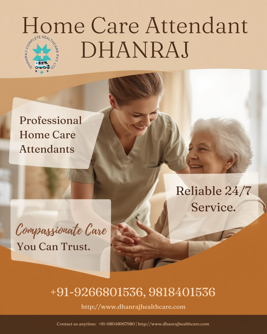 Dhanraj Home Care Services provides the most trusted and professional Healthcare Attendant At Home in Gurgaon. Our trained attendants, nurses, doctors, and emergency team are available 24ร7 to take care of your loved ones at home.