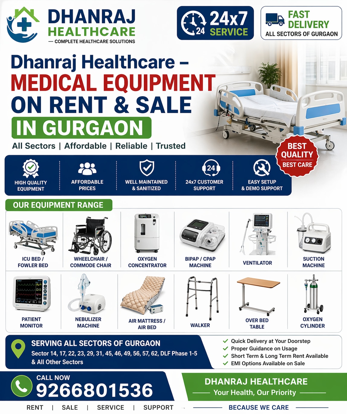 Gurgaon Medical Equipment for Rent and Purchase (All Sectors); Dhanraj Healthcare: In Gurgaon (Gurugram), Dhanraj Complete Healthcare Pvt. Ltd. provides reliable and reasonably priced medical equipment for sale and rental in various areas of NCR Delhi. We offer top-notch, hospital-grade equipment for at-home care, assisting patients in their safe and comfortable recuperation. ICU beds, Fowler beds, wheelchairs, oxygen concentrators, BiPAP/CPAP machines, suction machines, patient monitors, ventilators, and more are among the many pieces of equipment we offer. Every piece of equipment is ready for use right now after being thoroughly cleaned and inspected. We guarantee prompt delivery and installation in all sectors, including DLF Phases 1–5, Sector 14, Sector 22, Sector 28, Sector 56, Sector 57, Sector 62, and surrounding districts. In order to give patients and their families with seamless and trouble-free service, our staff also offers comprehensive usage and maintenance information. Reasons for Selecting Dhanraj Healthcare: ✏ Reliable Home Healthcare Service Provider ✏ Excellent & Sanitized Equipment ✏ Trained Support Team & Demo Assistance 24x7 Fast Delivery in All Gurgaon Sectors ✏ Reasonably Priced Rent & Best Price on Sale