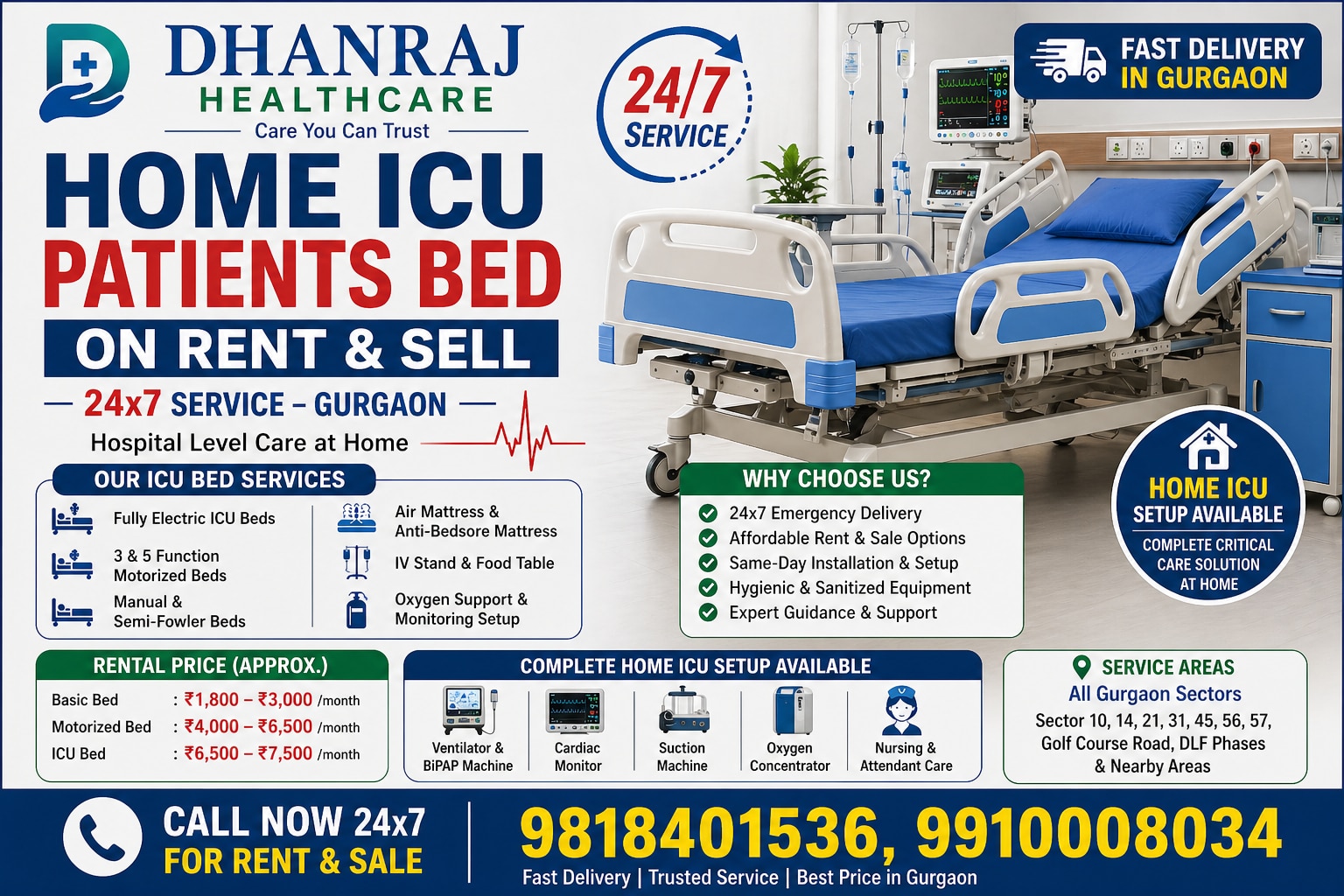 Home ICU Patient Beds in Gurgaon for Rent and Sale 24/7. Dhanraj Healthcare delivered ICU patient beds quickly and offered round-the-clock assistance in Gurgaon. For critical care patients, we rent and sell state-of-the-art hospital beds that guarantee their comfort, safety, and appropriate medical support at home. 🚑 Full Home ICU Configuration Available24x7: Additionally, we offer: Multiple medical instruments and monitoring systems are included in a comprehensive home ICU setup, allowing for hospital-level care at home. Services Provided by Dhanraj ICU Beds Include: ICU beds that are fully electric, motorized beds with three and five functions, manual and semi-fowler beds, air mattresses and anti-bedsore mattresses, IV stand and food table, monitoring setup, BiPAP and ventilator, cardiac monitor, suction machine, oxygen concentrator, nursing, and attendant care and alsoPhysiotherapy at home all are in 24x7 services available. Because these beds are made for home intensive care units, patients can get hospital-quality care without having to remain in a hospital. 💡 Why Do Customers Select Dhanraj Home ICU Bed Services? Emergency Delivery in Gurgaon, 24/7 Rent and Sale Options at Reasonable Prices Installation & Setup on the Same Day Sanitized and hygienic equipment, professional advice, and assistance ICU beds offer improved comfort and flexible placement for patients suffering from stroke, paralysis, post-surgery recuperation, and critical illness. The advantages of having an ICU bed at home In order to improve patient care, home ICU beds offer: Comfortable positions that can be changed Simple patient care for caregivers Avoiding bedsores Perfect for stroke, paralysis, and patients recovering from surgery 💰 Approximate Rental Cost in Gurgaon: Basic Bed: ₹1,800 to ₹3,000 per month ₹4,000 to ₹6,500 per month for a motorized bed ICU Bed: ₹6,500 to ₹7,500 per month 📍 We offer services in every sector of Gurgaon, such as: We cover every sector in Gurgaon, including the DLF Phase1, 2,3, 4, 5, 6, 7, Golf Course Road, Sectors 10, 14, 21, 28, 29, 31, 45, 51, 52, 53, 56, 57, and adjacent areas.