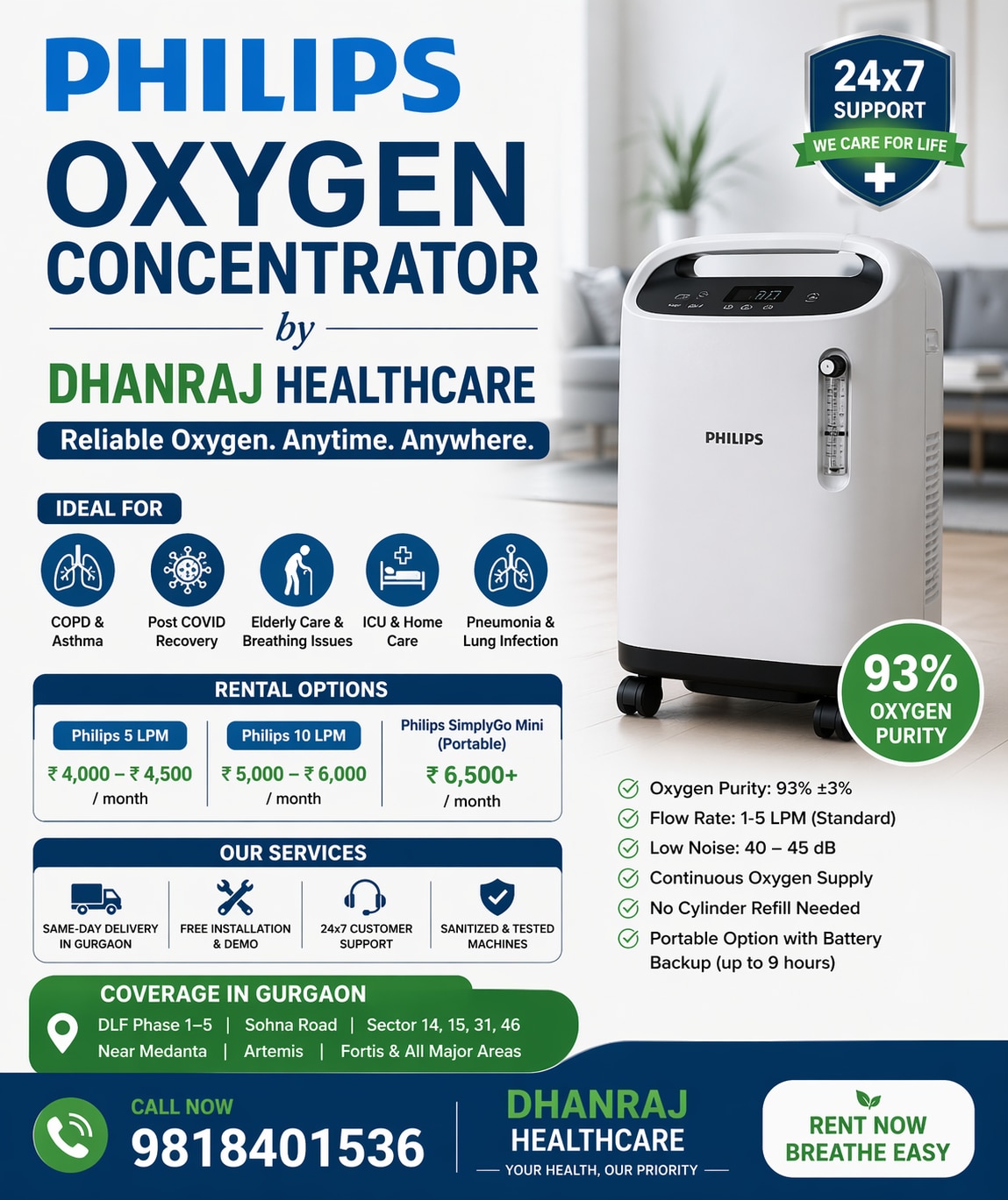 Oxygen Concentrator on Rent and Sell 24x7 – Gurgaon Everyone knows that the air around us is becoming more and more polluted. It is detrimental to your health, particularly if you have asthma or other respiratory issues. You can clean up and eliminate various contaminants from the air in your home with our oxygen concentrator. Get the best oxygen concentrator on rent in Gurgaon by putting your trust in us. 🏥 Rentable Philips Oxygen Concentrator in Gurgaon ✅ Available Choices Philips Concentrator, 5 LPM (Home Use) Philips Concentrator (High Flow) 10 LPM The portable Philips SimplyGo Mini 💰 Gurgaon Rental Price Philips 5L: between ₹4,000 and ₹4,500 per month Philips 10L: between ₹5,000 and ₹6,000 per month Philips SimplyGo portable: more than ₹6,500 per month Some companies provide basic models for as little as ₹3,000 per month. Services Provided; Gurgaon same-day or one -to three-hour delivery Free installation and demo; round-the-clock assistance Before delivery, machines were cleaned and tested. ⚙️ Features of Philips Machines 93% ±3% oxygen purity Flow rate: standard: 1–5 LPM 40–45 dB of low noise Constant oxygen supply (no need to replace cylinders) There is a portable option with a 9-hour battery backup. 👨⚔️ Is It Needed? COPD and asthma sufferers COVID-19 recovery Elderly breathing problems Lung infection and pneumonia Long-term oxygen therapy or an ICU at home 📍 Coverage of Gurgaon Services Accessible in every major area: Phases 1, 2, 3, 4, 5, and 6 of DLF... Sectors 14, 15, 28, 29, 31, 46, 49, 51, 52, and 53 of Sohna Road. Artemis Hospital, Max Hospital, Naryana Hospital, Sanar Hospital, Fortis Hospitals, and Medanta.......... Everyone knows that the air around us is becoming more and more polluted. It is detrimental to your health, particularly if you have asthma or other respiratory issues. You can clean up and eliminate more contaminants from the air in your home with our oxygen concentrator. Get the best oxygen concentrator on rent in Gurgaon by putting your trust in us.