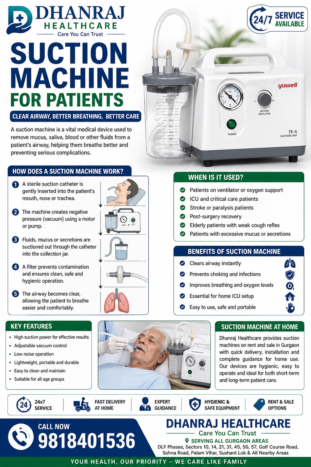 Patient Suction Machine Rental and Sell: Operation & Advantages | Dhanraj Healthcare A vital medical tool for clearing a patient's airway of mucus, saliva, blood, or other fluids is a suction machine. For patients who are unable to expel secretions on their own, it keeps the airway free and facilitates breathing. 📍 Gurgaon Service Areas Dhanraj Healthcare rents out suction machines in all of Gurgaon's main locations: DLF Phases 1, 2, 3, 4, 5 Sectors 10, 14, 21, 31, 45, 56, 57 Sushant Lok 1, 2, 3 Golf Course Road & Extension Sohna Road Palam Vihar New Gurgaon (Sectors 82–95) Every Gurgaon neighborhood. ⚙️ A Suction Machine's Operation The suction machine draws fluids from the patient's airway into a collection jar by generating negative pressure, or vacuum. Gently insert a sterile suction catheter into the patient's trachea, nose, or mouth. The device uses a pump or motor to create suction. Fluids are gathered in a sealed container for safety. A filter guards against infection and guarantees hygiene. This procedure keeps the oxygen flowing properly and avoids breathing issues. 🏥 When Does It Get Used? Individuals receiving oxygen or a ventilator Critical care or intensive care unit patients Patients with paralysis or stroke Recuperation following surgery Cough reflex weakness in elderly patients The advantages of a suction machine instantly clears the airway avoids infections and choking increases oxygen levels and breathing Crucial for setting up a home intensive care unit Simple and portable 🏡 Suction Machine at Home: Dhanraj Healthcare Dhanraj Healthcare offers suction devices for sale and rental in Gurgaon, along with prompt delivery and appropriate home usage instructions. Our equipment is hygienic, simple to use, and appropriate for both short-term and long-term patient care.